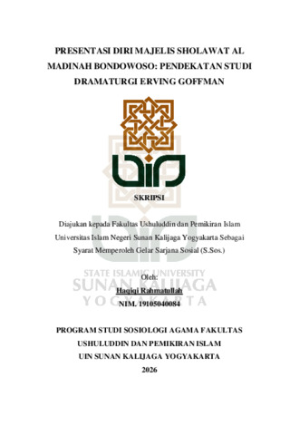Haqiqi Rahmatullah, NIM.: 19105040084 (2026) PRESENTASI DIRI MAJELIS SHOLAWAT AL MADINAH BONDOWOSO: PENDEKATAN STUDI DRAMATURGI ERVING GOFFMAN. Skripsi thesis, UIN SUNAN KALIJAGA YOGYAKARTA.