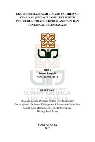 Imron Rasyadi, NIM.: 20300012016 (2026) EKSISTENSI MADRASAH DINIYAH TAKMILIYAH AWALIYAH (MDTA) DI JAMBI: PERSPEKTIF PENGELOLA, STRATEGI KEBERLANJUTAN, DAN TANTANGAN KELEMBAGAAN. Doctoral thesis, UIN SUNAN KALIJAGA YOGYAKARTA.