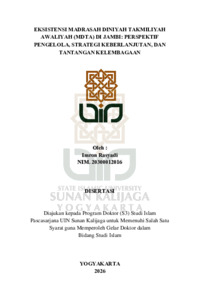 This dissertation is triggered by the anxiety about the existence continuation of Madrasah Diniyal Takmiliyah Awaliyah (MDTA) of Jambi over the period of 2010 to 2025, amid modern education and social changes. While the government gives the management of MDTA flexibility and creativity to always meet the changing needs, many madrasahs in Jambi run the school with inadequate number of students, weakening society’s support, and critical identity which leads to collapse. The continuation of such school, however, is closely dependent upon the management’s perspective since the stakeholders’ viewpoint can bring an institution progress. This study overlooks the management’s points of view, the adapting strategy, and the primary challenge before offering a sustainability concept which makes MDTA always relevant and survive in this modern era, Employing a phenomenology approach, this qualitative ressearch was carried out in two regions whose cgaracteristic is different (i.e. Merangin District and the town of Jambi). The objects of study were four MDTAs, selected under purposive sampling technique. Data were collected through in-depth interviews, on-site observations, and document reviews. They were analyzed according to the following steps: reduction, display, and conclusion-drawing, and then being validated systematically. The study discovered that (1) from 2010 to 2025, the vision and mission of MDTA were just an administrative formality; the management of MDTA went on a simple way; MDTA was regarded as a Non-Governmental Organization. MDTA served as an Islamic tradition guardian, and as a formal-education complementary body. (2) MDTA of Jambi has set a formula for enabling the institution to adjust itself to the society’s growing demand. The policy involves schedule synchronization, flexible curriculum development, and extracurricular exertion, such as tahfiz and Islamic arts. A number of MDTAs waive school fees and invite the third parties to participate financially in the running of the schools. (3) The MDTA management faces some difficulties, such as high-quality teacher shortage, training opportunity inadequacy, finance resource impediment, and societysupport deficit. Competition between modern Islamic schools and the religion integration at school also demotivates some student-to-be. This dissertation presents a perspective on the management of MDTA, namely being manifested in the shift from traditional conventional perspective to social-responsive management approach.