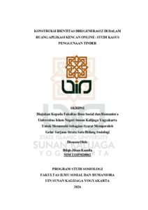 Bilqis Jihan Kamila, NIM.: 21107020042 (2026) KONSTRUKSI IDENTITAS DIRI GENERASI Z DI DALAM RUANG APLIKASI KENCAN ONLINE : STUDI KASUS PENGGUNAAN TINDER. Skripsi thesis, UIN SUNAN KALIJAGA YOGYAKARTA.