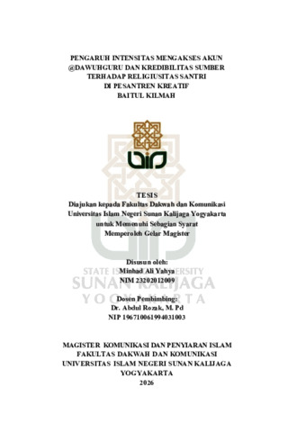 Minhad Ali Yahya, NIM.: 23202012009 (2026) PENGARUH INTENSITAS MENGAKSES AKUN @DAWUHGURU DAN KREDIBILITAS SUMBER TERHADAP RELIGIUSITAS SANTRI DI PESANTREN KREATIF BAITUL KILMAH. Masters thesis, UIN SUNAN KALIJAGA YOGYAKARTA.