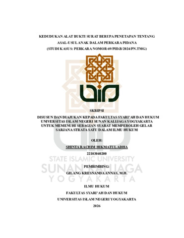 Shinta Rachim Hikmatul Adha, NIM.: 22103040200 (2026) KEDUDUKAN ALAT BUKTI SURAT BERUPA PENETAPAN TENTANG ASAL-USUL ANAK DALAM PERKARA PIDANA (STUDI KASUS: PERKARA NOMOR 69/PID.B/2024/PN.TMG). Skripsi thesis, UIN SUNAN KALIJAGA YOGYAKARTA.