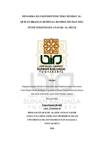 Fanza Fauzan Rivaldi, NIM.: 22105030130 (2026) DINAMIKA DAN KONSISTENSI TEKS MUSHAF AL-QUR’AN BRAILLE KEMENAG RI EDISI 2013 DAN 2023: STUDI TEKSTOLOGI ATAS QS. AL-MULK. Skripsi thesis, UIN SUNAN KALIJAGA YOGYAKARTA.