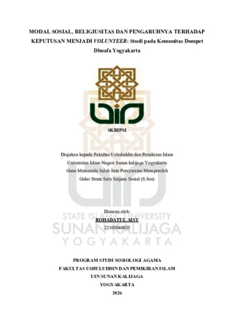 Rohadatul Aisy, NIM.: 22105040035 (2026) MODAL SOSIAL, RELIGIUSITAS DAN PENGARUHNYA TERHADAP KEPUTUSAN MENJADI VOLUNTEER: STUDI PADA KOMUNITAS DOMPET DHUAFA YOGYAKARTA. Skripsi thesis, UIN SUNAN KALIJAGA YOGYAKARTA.
