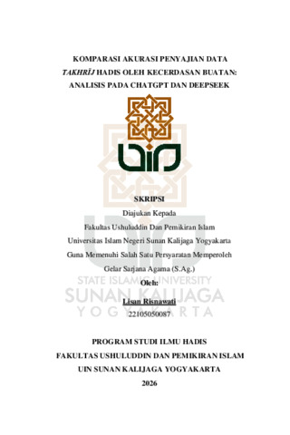 Lisan Risnawati, NIM.: 22105050087 (2026) KOMPARASI AKURASI PENYAJIAN DATA TAKHRIJ HADIS OLEH KECERDASAN BUATAN: ANALISIS PADA CHATGPT DAN DEEPSEEK. Skripsi thesis, UIN SUNAN KALIJAGA YOGYAKARTA.