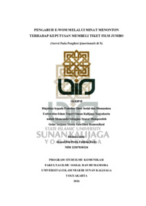 Ahmad Dio Putra Fatikha Rizky, NIM.: 22107030124 (2026) PENGARUH E-WOM MELALUI MINAT MENONTON TERHADAP KEPUTUSAN MEMBELI TIKET FILM JUMBO (SURVEI PADA PENGIKUT @MOVIEMNFS DI X). Skripsi thesis, UIN SUNAN KALIJAGA YOGYAKARTA.