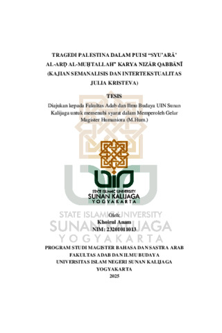 Khoirul Anam, NIM.: 23201011013 (2025) TRAGEDI PALESTINA DALAM PUISI “SYUARA AL-ARD AL-MUHTALLAH” KARYA NIZAR QABBANI (KAJIAN SEMANALISIS DAN INTERTEKSTUALITAS JULIA KRISTEVA). Masters thesis, UIN SUNAN KALIJAGA YOGYAKARTA.