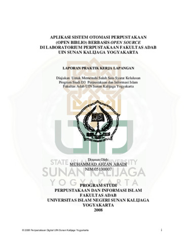 Muhammad Afzan Abadi, NIM.: 05130007 (2008) APLIKASI SISTEM OTOMASI PERPUSTAKAAN (OPEN BIBLIO) BERBASIS OPEN SOURCE DI LABORATORIUM PERPUSTAKAAN FAKULTAS ADAB UIN SUNAN KALIJAGA YOGYAKARTA. Laporan D3 thesis, UIN SUNAN KALIJAGA YOGYAKARTA.